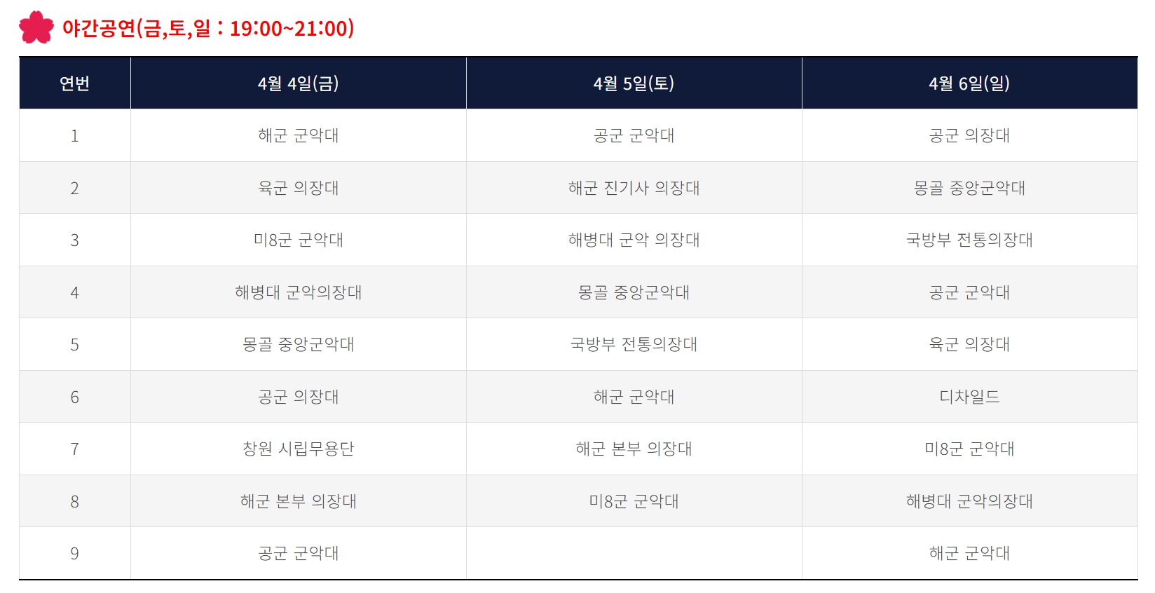 진해 군항제의 대표적인 행사 중 하나는 군악의장 페스티벌입니다. 대한민국 해군 군악대 및 의장대가 펼치는 퍼레이드와 공연은 웅장하면서도 감동적인 분위기를 연출합니다.